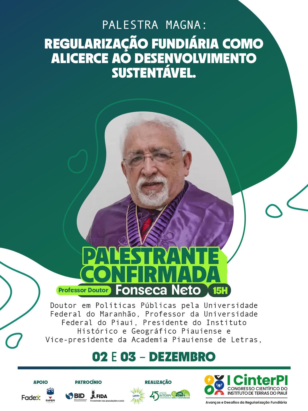 • 15h – Palestra Magna: “Regularização Fundiária como Alicerce ao Desenvolvimento Sustentável”, com o Prof. Dr. Fonseca Neto