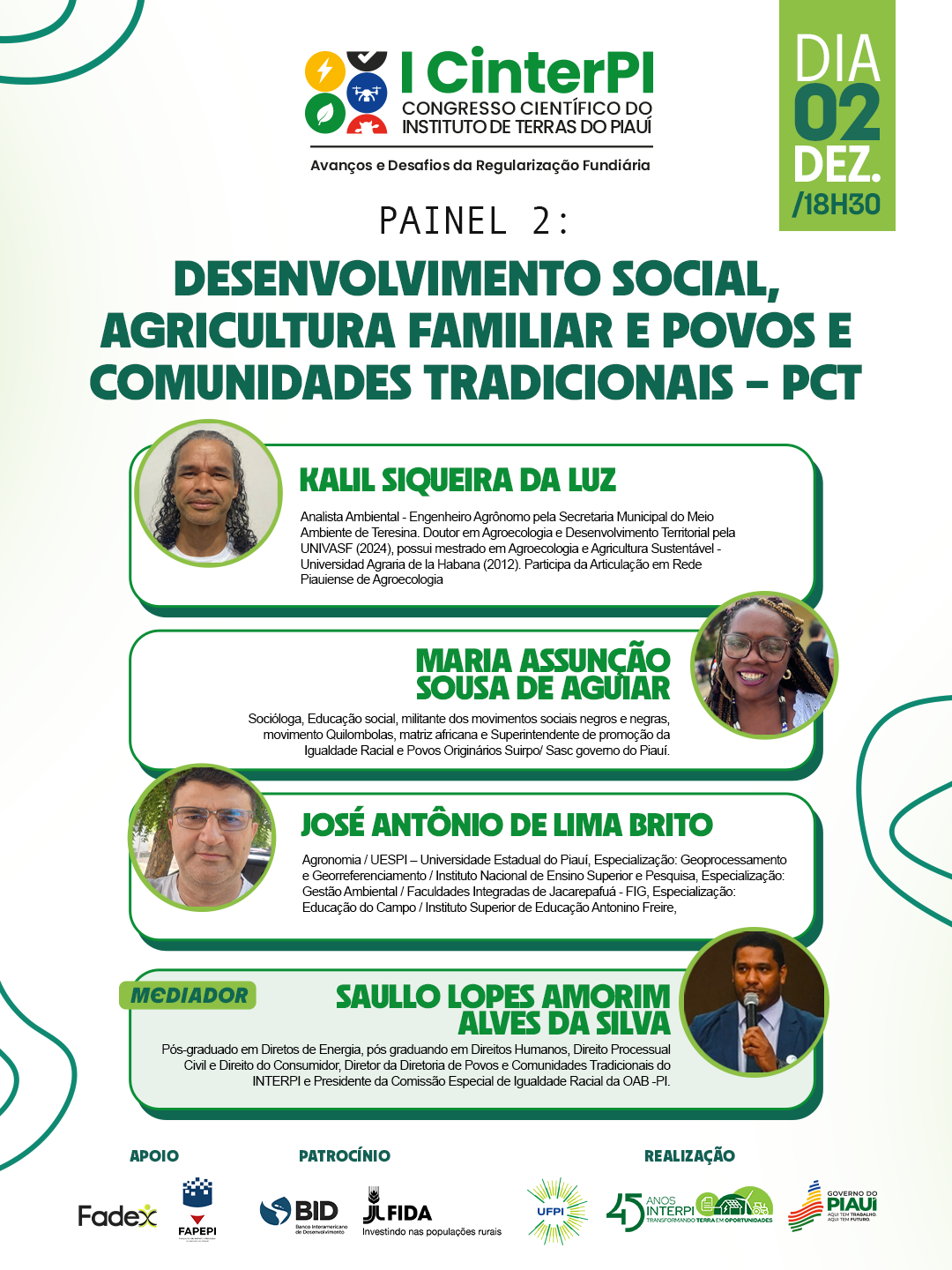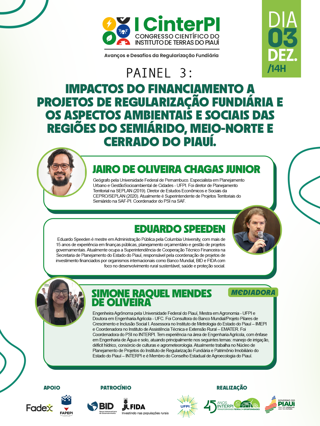 A iniciativa pioneira do Governo do Estado, conta também com o apoio da Fundação de Amparo à Pesquisa do Estado do Piauí (Fapepi) e da Fundação Cultural e de Fomento à Pesquisa, Ensino, Extensão e Inovação (Fadex), e patrocínio do Banco Interamericano de Desenvolvimento (BID) e do Fundo Internacional de Desenvolvimento Agrícola (FIDA), reunindo pesquisadores, estudantes, gestores e profissionais da área em um ambiente híbrido, com participação presencial e acesso remoto para todo o país.