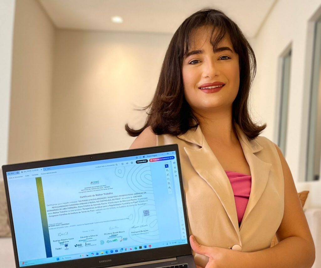 Entre os trabalhos premiados, destacou-se o artigo “Da Propriedade à Regularização: desafios e perspectivas jurídicas da regularização fundiária urbana e rural no Centro-Sul do Piauí”, de Joicyara Bernardes de Lima Ferreira, Hiane Cristina de Azevedo Rocha e Vitória Joyce da Silva Leal Rocha. A coautora Hiane Azevedo, advogada de Bocaina, afirmou: