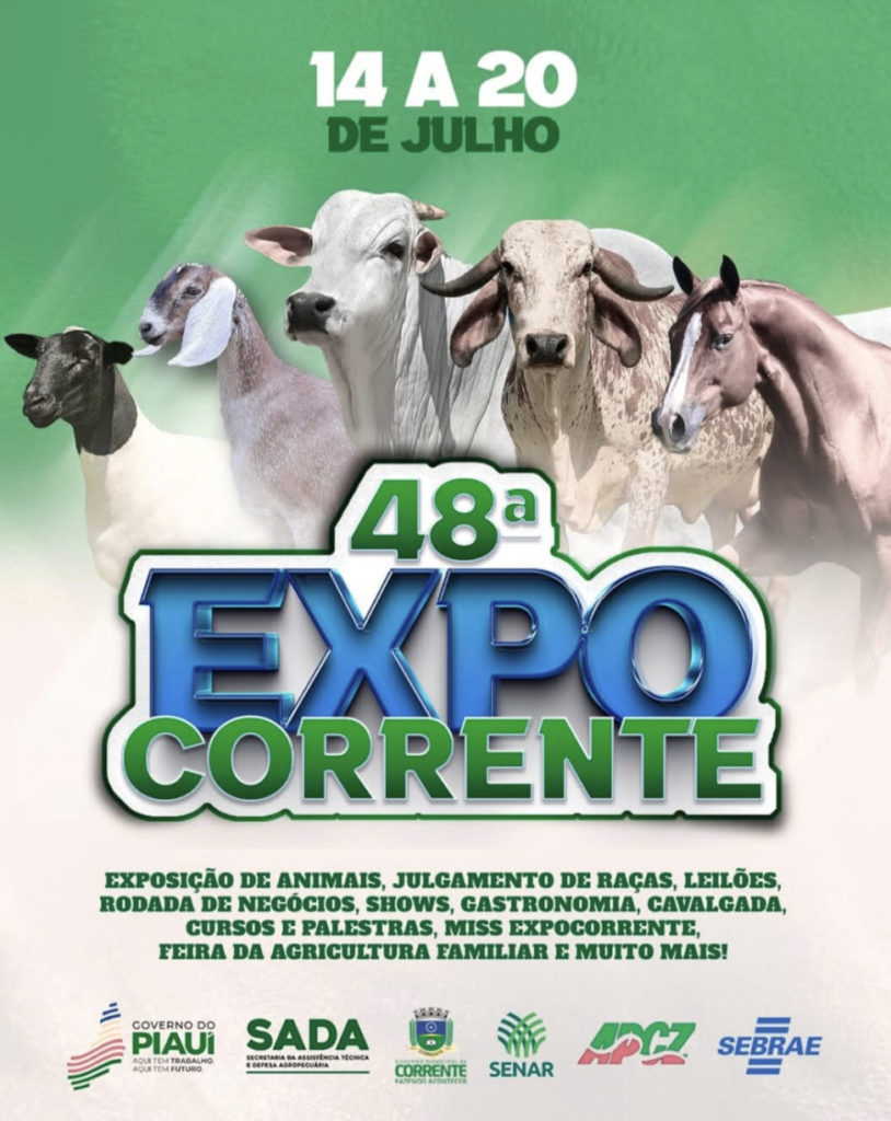 Promovida pelo Governo do Estado, por meio da Secretaria da Assistência Técnica e Defesa Agropecuária (Sada), em parceria com a Associação Piauiense de Criadores de Zebu (APCZ), a Expocorrente reunirá uma programação voltada ao setor agropecuário, com palestras, cursos, exposições e encontros técnicos voltados a produtores, estudantes e gestores públicos.
